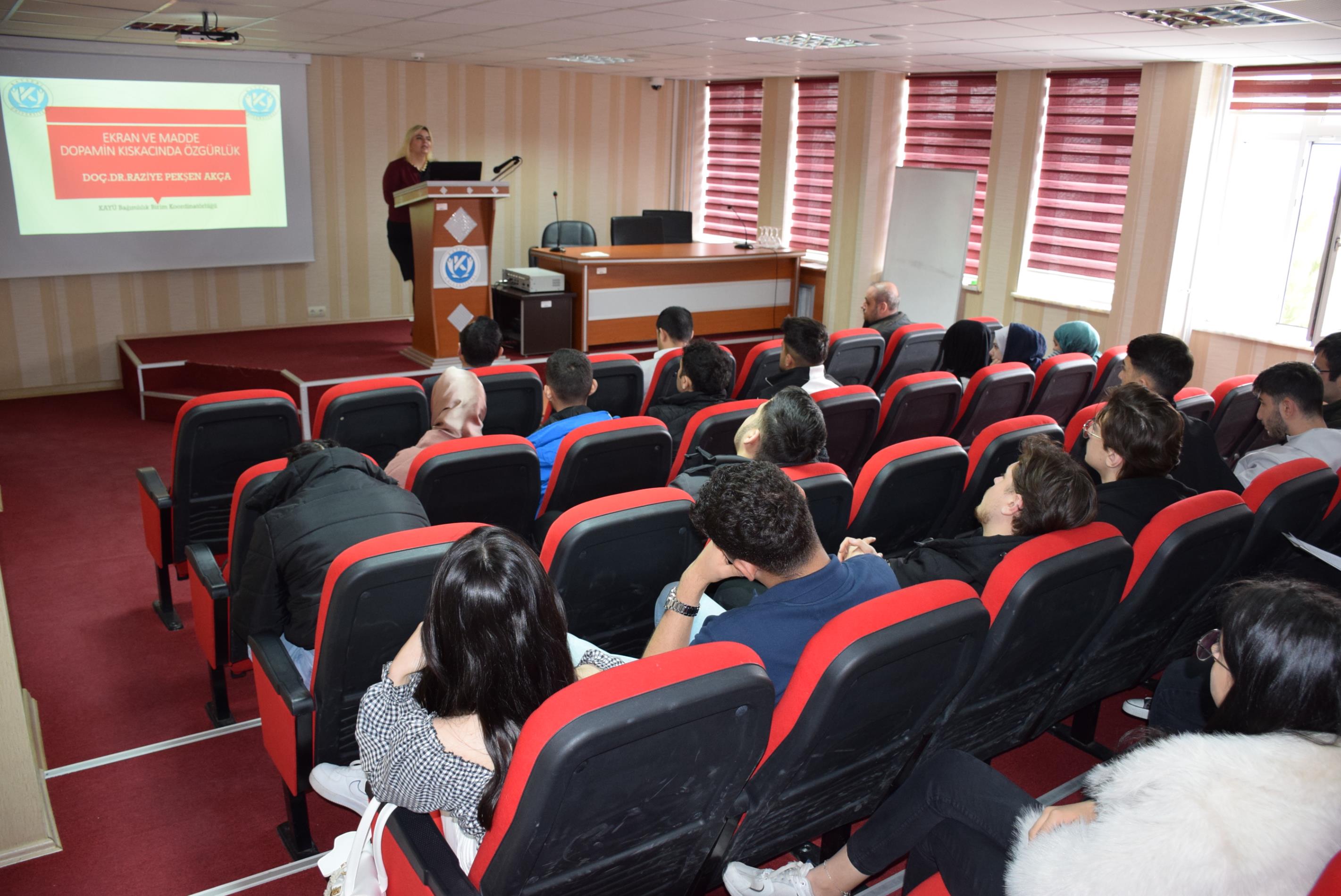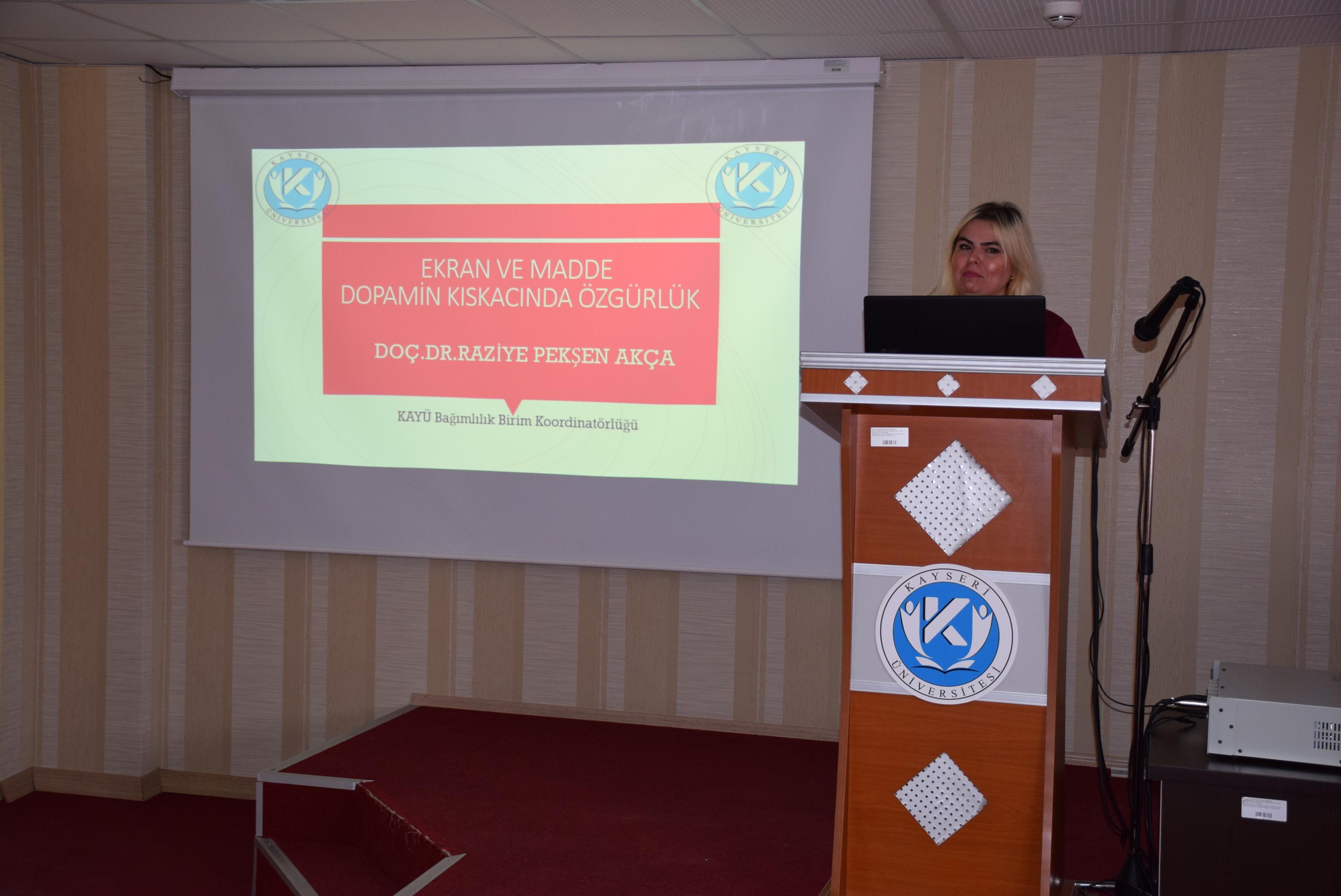 Yüksekokulumuzda, dijitalleşen dünyada bireyin özgürlüğünü ve zihinsel sağlığını tehdit eden unsurların ele alındığı “Ekran ve Madde: Dopamin Kıskacında Özgürlük” konulu bir konferans gerçekleştirildi. Konferansa konuşmacı olarak katılan Doç. Dr. Raziye Pekşen Akça, ekran ve Madde bağımlılığı gençlerin dijital platformlarda karşılaştığı "haz odaklı" kıskacın gerçek özgürlüğü nasıl kısıtladığına dair önemli paylaşımlarda bulundu. Konferans sonunda, değerli katkılarından dolayı Doç. Dr. Raziye Pekşen Akça’ya Yüksekokulumuz Müdürü Dr. Öğr. Üyesi İbrahim Bektaş teşekkür belgesi takdim etti.