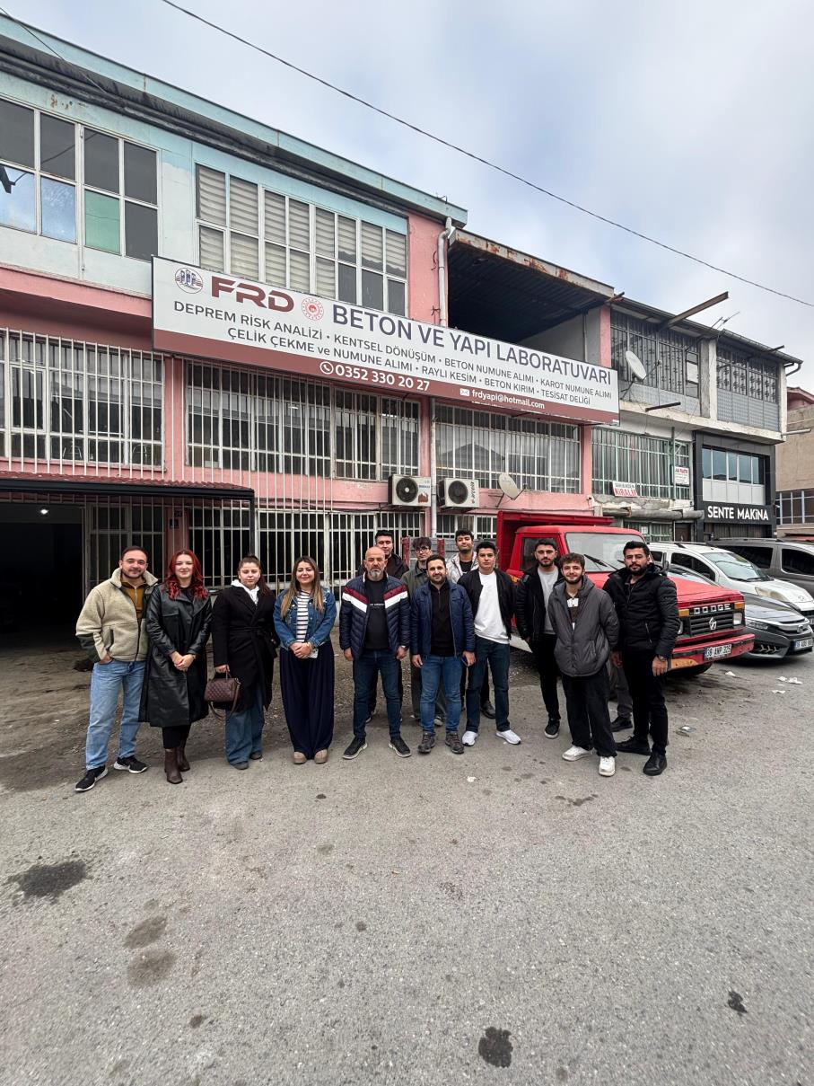 Laboratuvar Deneyleri dersi kapsamında, Öğretim Görevlisi Ufuk Tunç’un gözetiminde, İnşaat Teknolojisi 2. sınıf öğrencilerine beton ve yapı laboratuvarlarında testlerin ve raporlama süreçlerinin nasıl gerçekleştirildiğini göstermek ve süreç hakkında bilgi vermek amacıyla FRD Beton ve Yapı Laboratuvarı firmasına teknik gezi düzenlenmiştir.